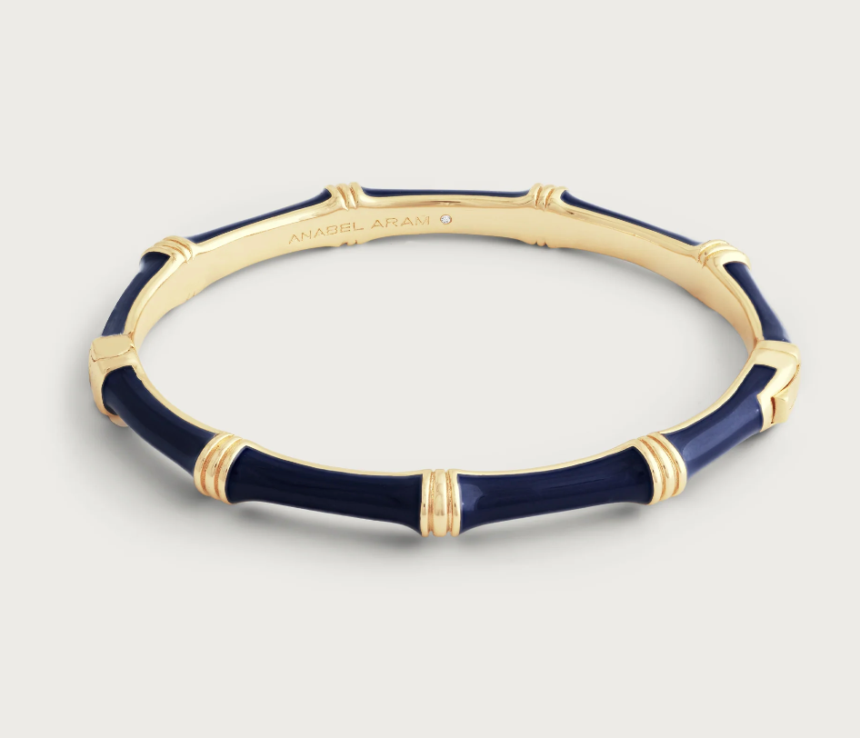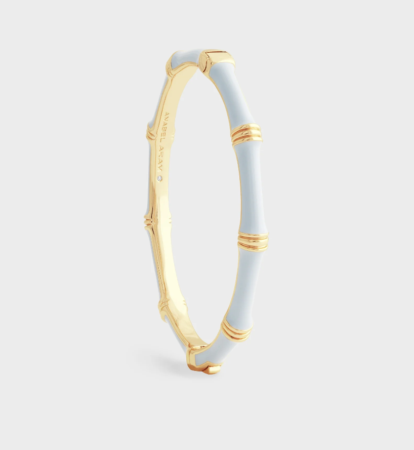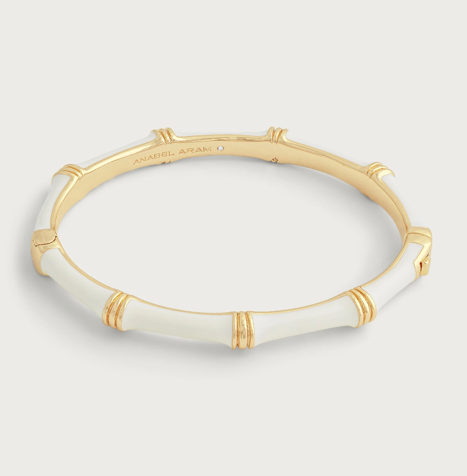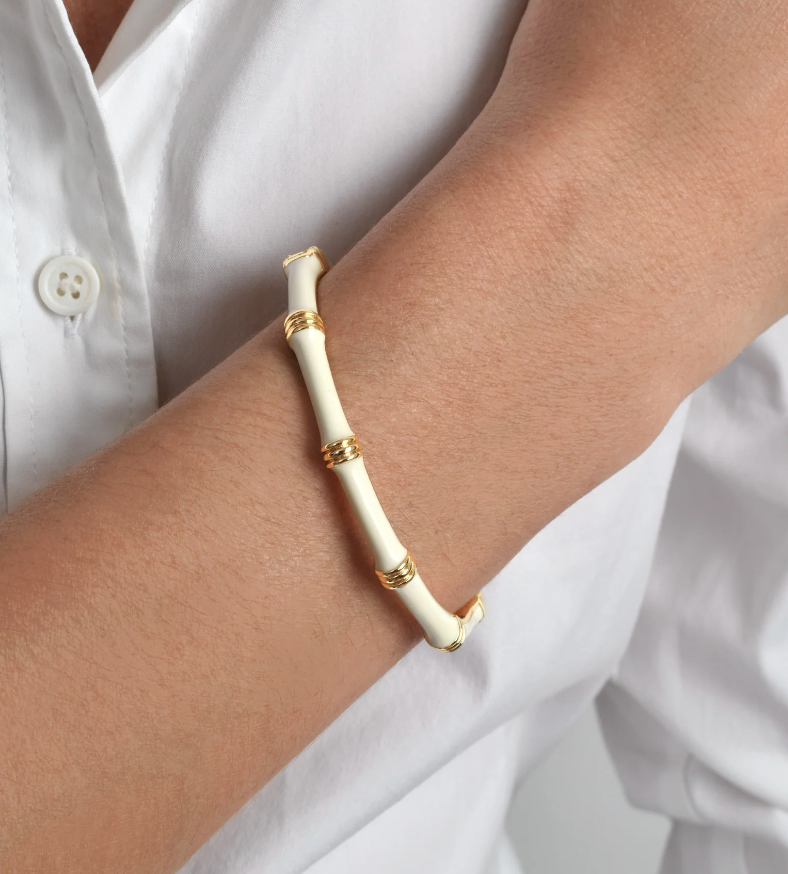 Elevate your everyday looks with the radiant allure of this bamboo hinged bangle, now in 4 new beautiful hand painted enamel colors. Crafted from sumptuous 18k gold-dipped brass, the bangle is sculpted to perfection, adorned with sparkling crystals that catch the light with every movement. Its secure hidden clasp, reminiscent of the finest jewelry craftsmanship, ensures both elegance and ease of wear, making it a refined accessory for any occasion. In the realm of accessories, this bamboo hinged bangle stands out as an exceptional piece of artistry. The intricacy of the sculpted design and the shimmering crystals culminate in a perfect union of glamour and versatility. The hidden clasp adds an element of mystery and refinement, making this bangle a stunning addition to your collection. Whether paired with casual or formal attire, it promises to be the perfect touch of sophistication, adding a radiant sparkle to your daily ensembles.