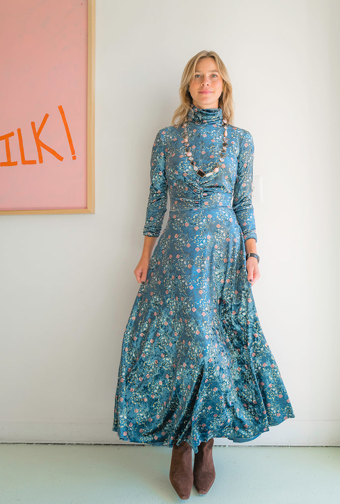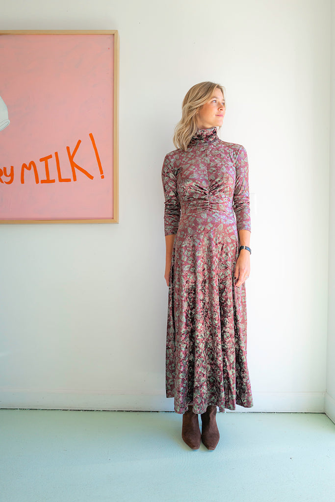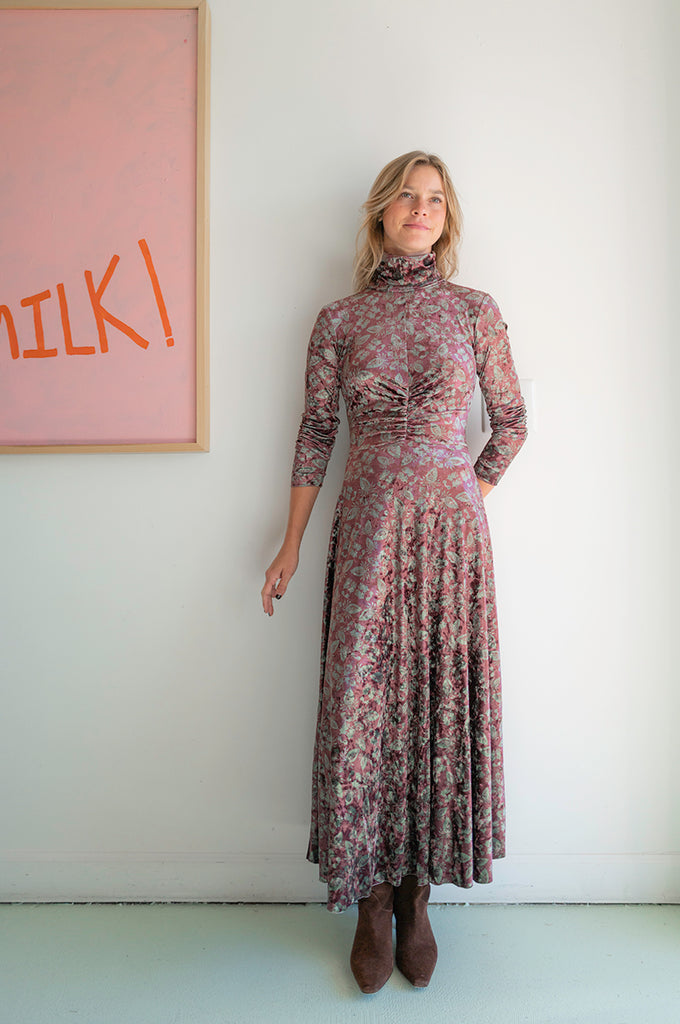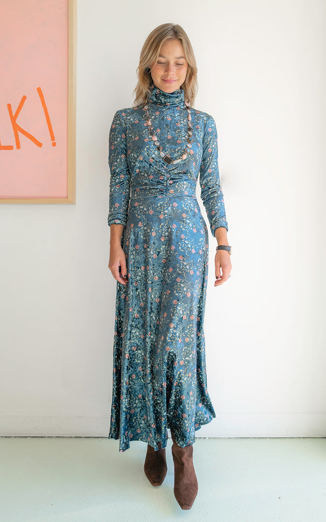 Opulent and eye-catching, this Franco Ferrari dress is crafted in plush velvet that catches the light with a luxurious sheen. Designed with a body-skimming silhouette, it features a mock neckline, long sleeves, and artful ruching at the waist to create a flattering drape and defined shape. Falling to a graceful ankle-grazing length, the dress is finished with a kaleidoscopic floral motif in jewel tones—emerald, fuchsia, and sapphire—that feels both decadent and modern.