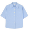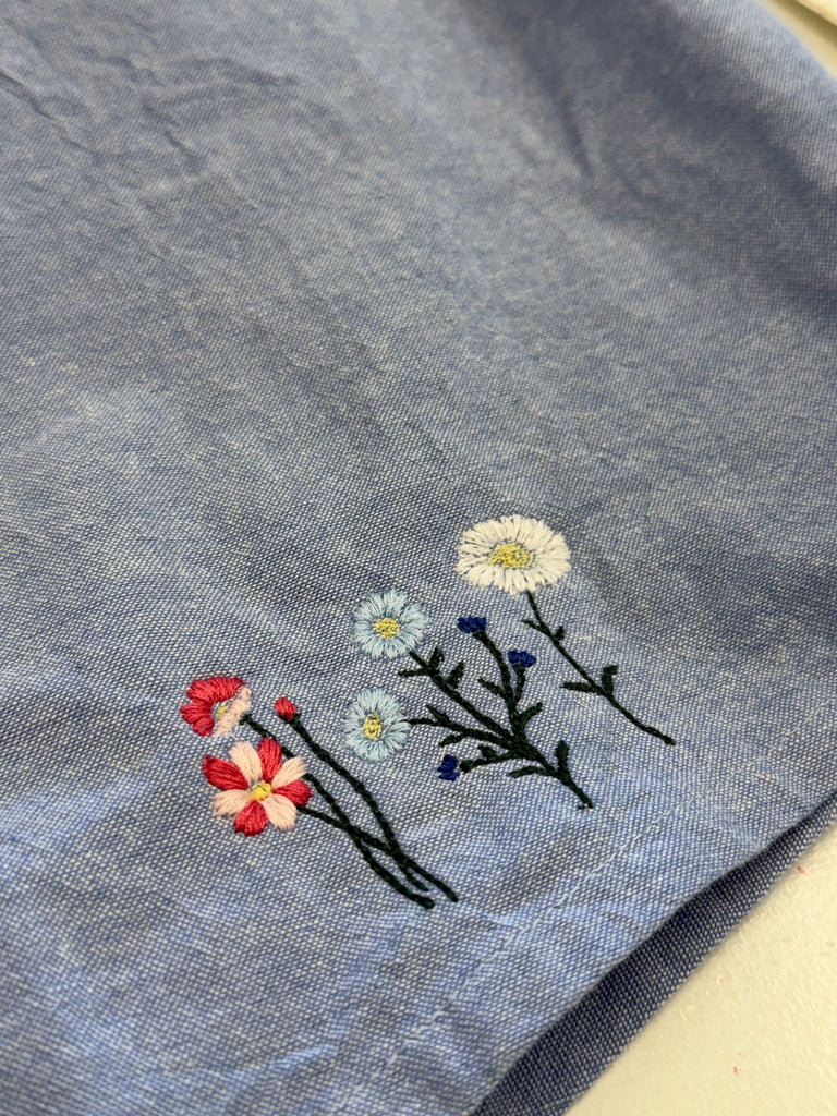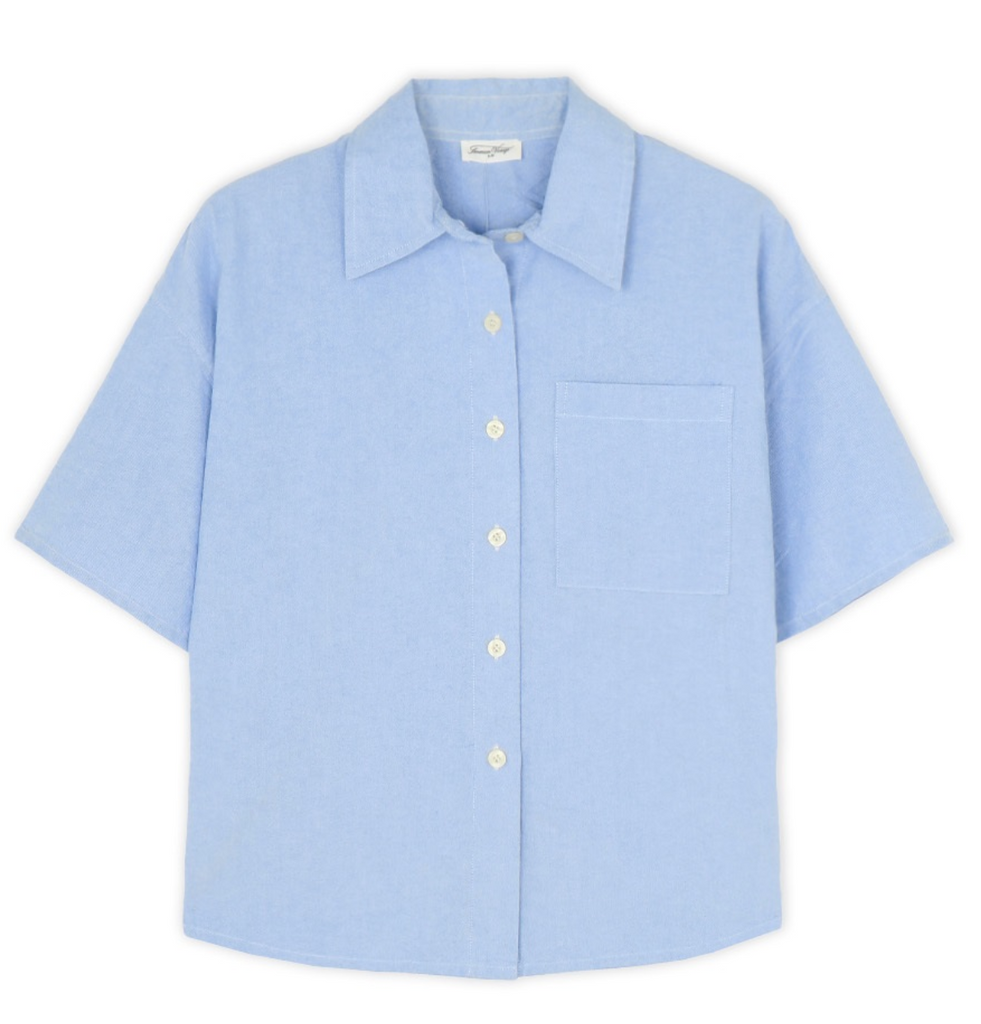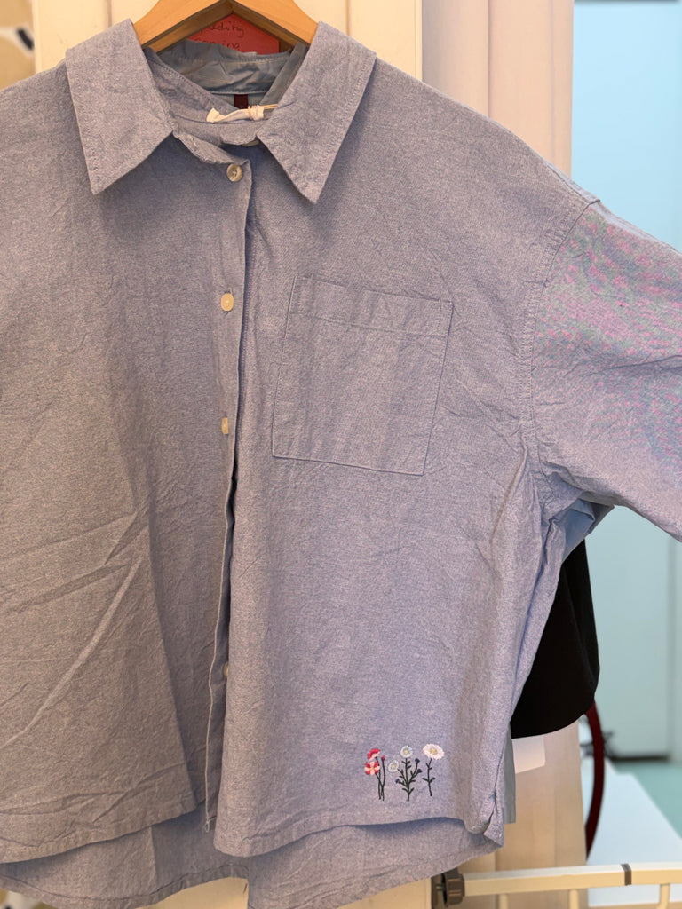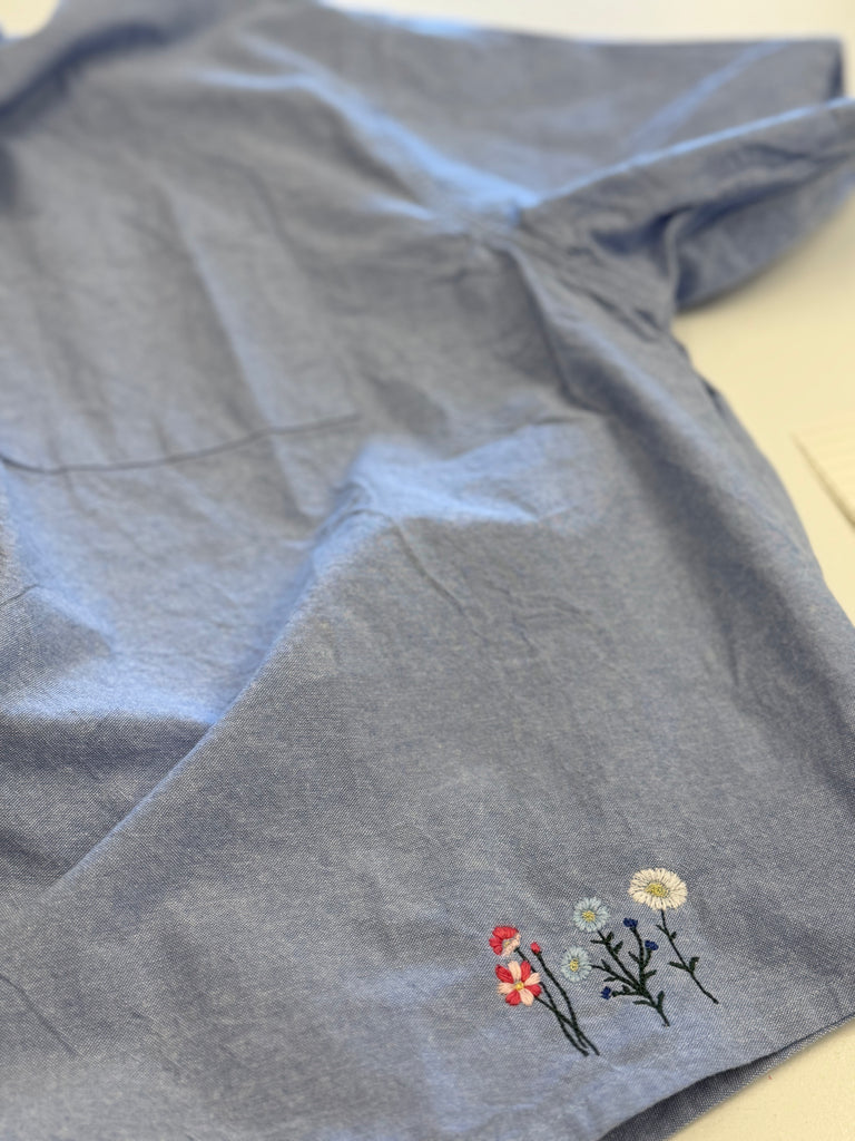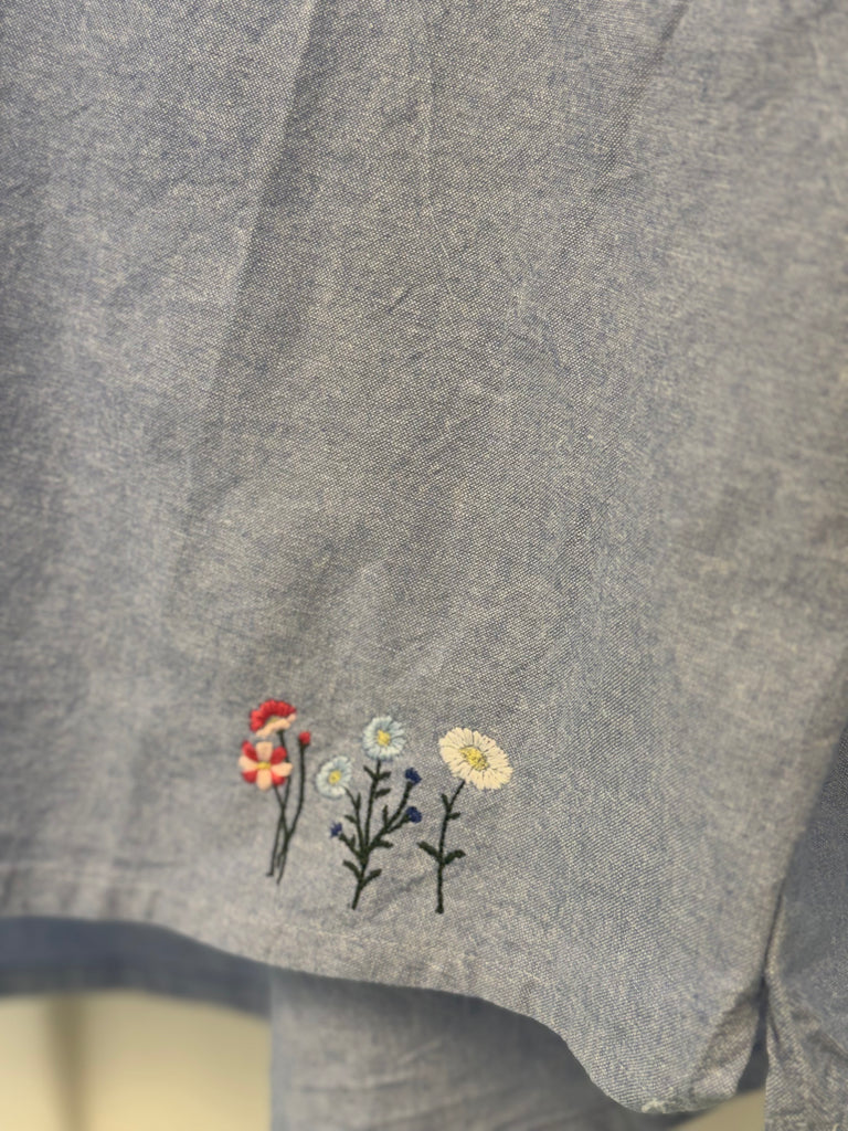 Short sleeved boxy oxford shirt with floral embroidery along the hem.