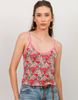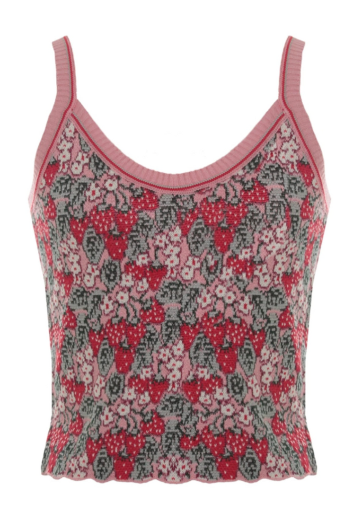 nit fabric stands out for its exclusive strawberry print developed using our technique. It features ribbed trim on the straps in a pink tone.