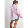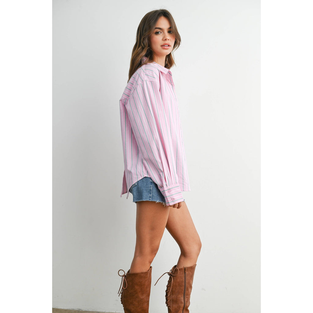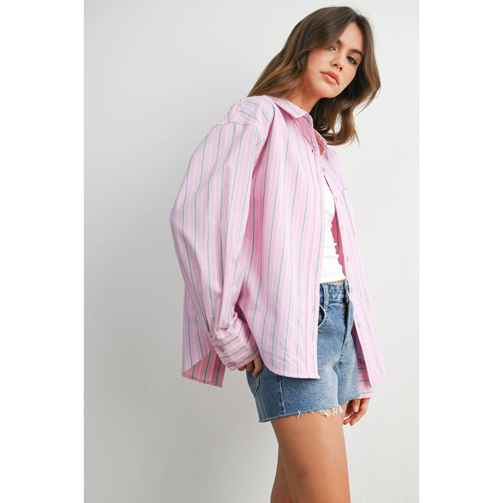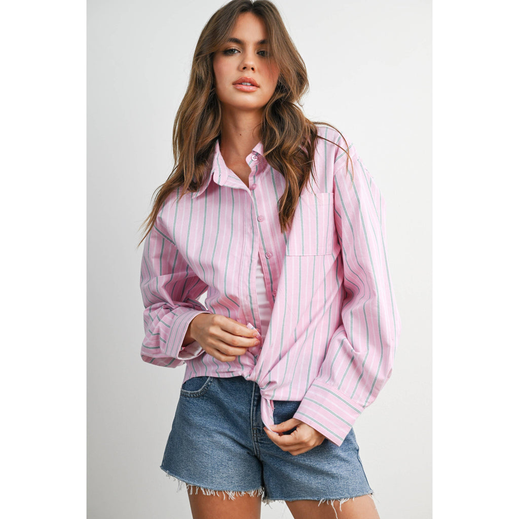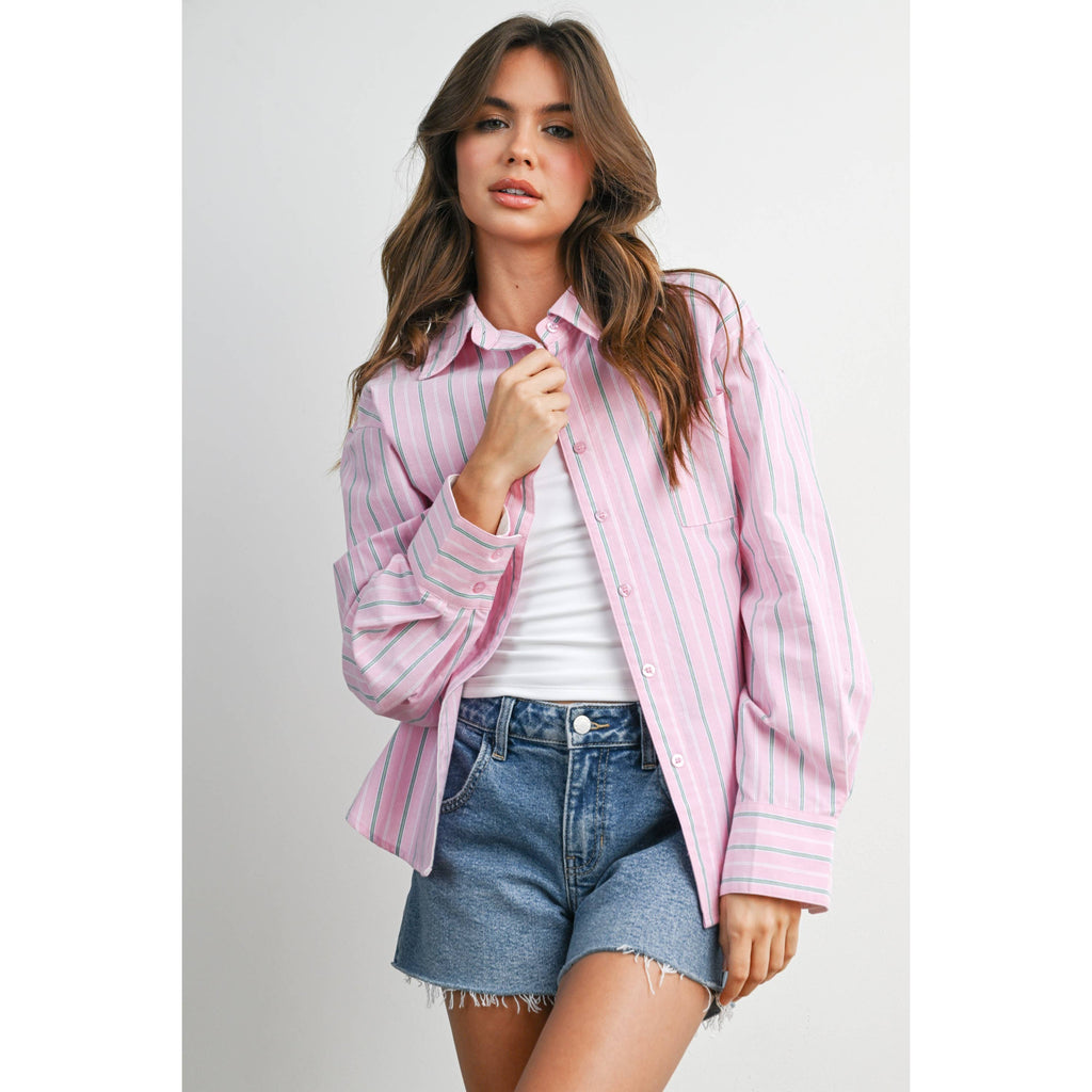 A timeless essential, this striped long-sleeve button-up shirt offers a crisp, tailored look with versatile styling. Lightweight and breathable, it's perfect for layering or wearing on its own. Ideal for both casual days and polished office outfits. SELF:100%COTTON LINING: 50%COTTON50%POLYESTER