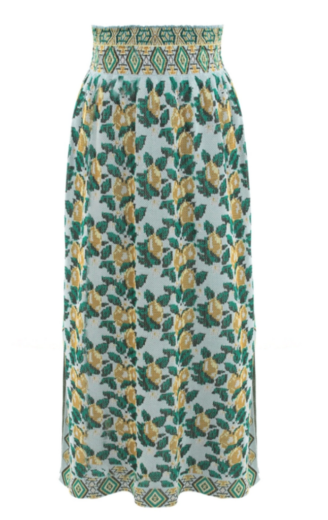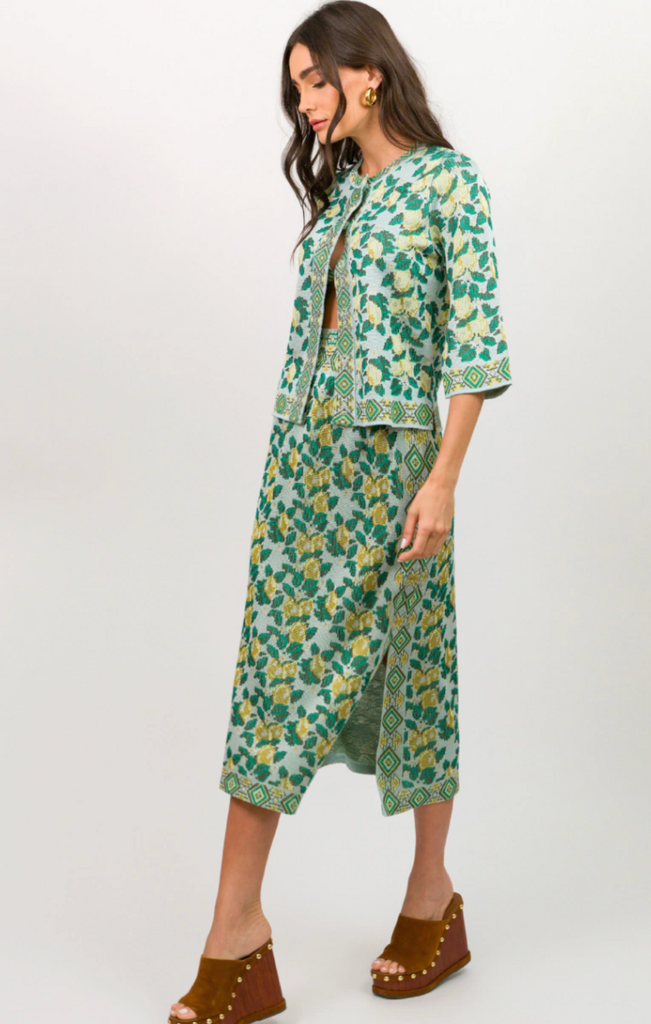 the essential piece for those seeking sophistication with a touch of freshness. Made of knit fabric, its jacquard print of Sicilian lemons brings a unique and delicate charm. Combine it with the Zara jacket in the same print for an elegant and coordinated look, or with the Anastacia bikini for a resort look full of personality. A refined choice that combines comfort and style for any occasion.