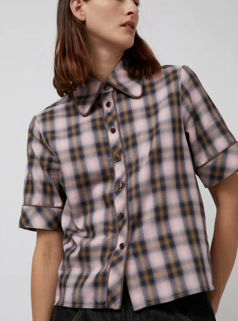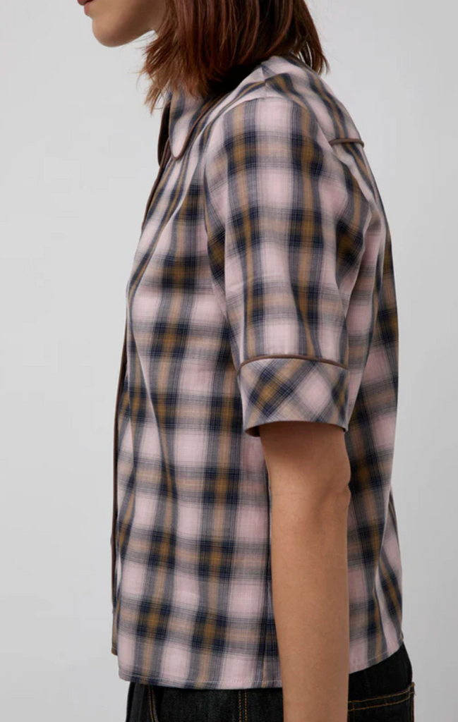 100% cotton short-sleeve collared button-down with straight across hem. Muted pink plaid.