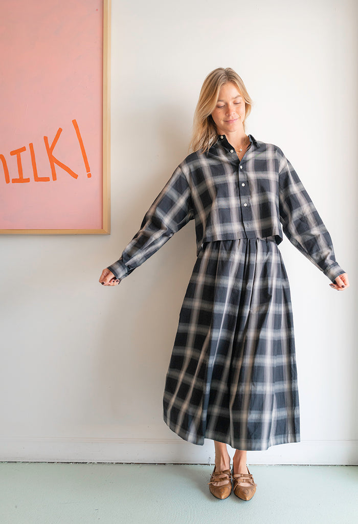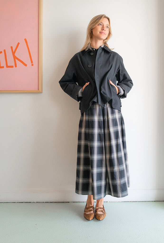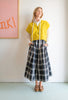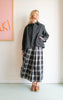 We love the gray/black/white plaid of the Dolly skirt because it matches everything. Pair it with the neutrals or the brights. Elastic waist with pockets and a drawstring waist.
