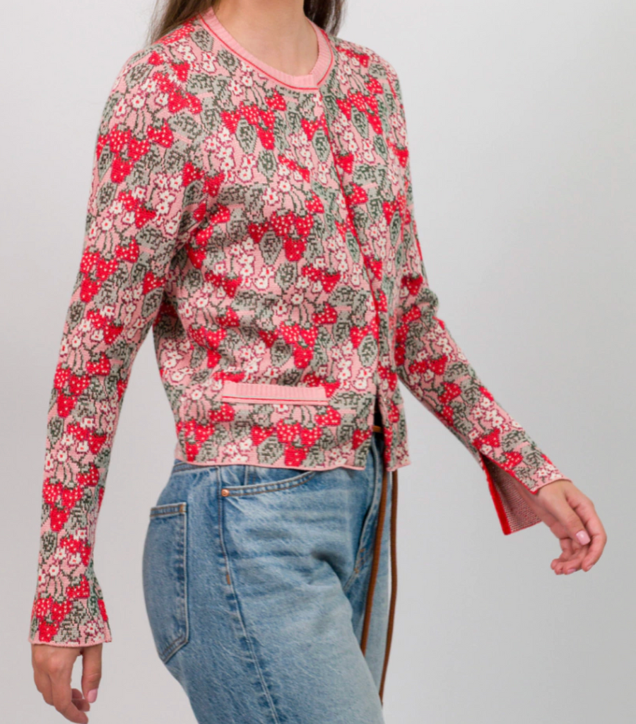 A piece that celebrates the delicacy and sophistication of knitwear. Featuring a subtle and feminine strawberry jacquard , this jacket is ideal for those seeking elegance with a touch of charm.