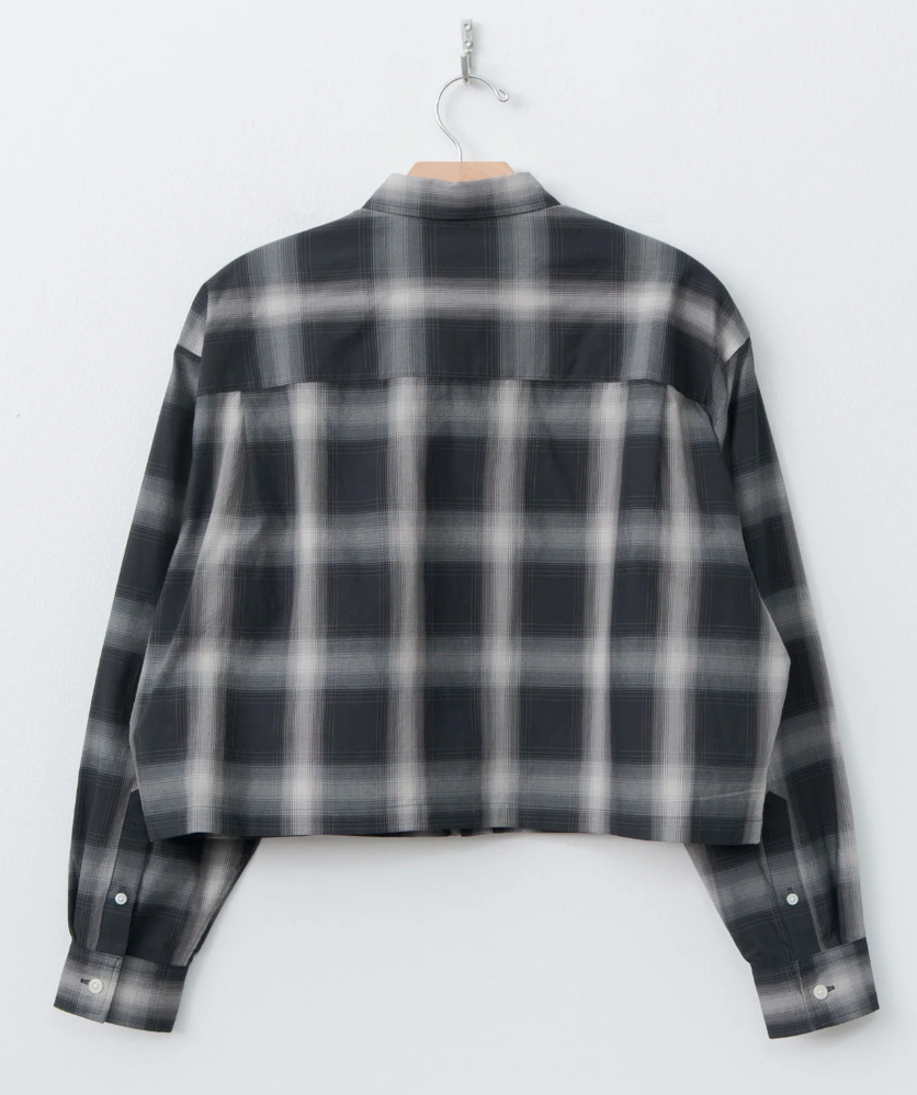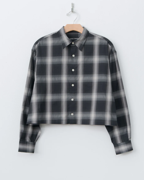 A cropped button-down shirt with a relaxed fit, crafted from N&N's custom cotton-nylon blend - it is wonderfully lightweight with a crinkled surface and a dry hand. Details include a regular collar, dropped shoulders, and buttoned cuff.
