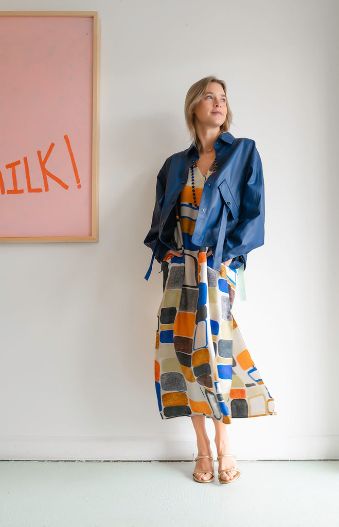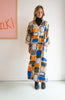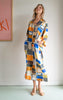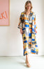 V-neck silk caftan with wrist length bell sleeves. Pockets and side slits.